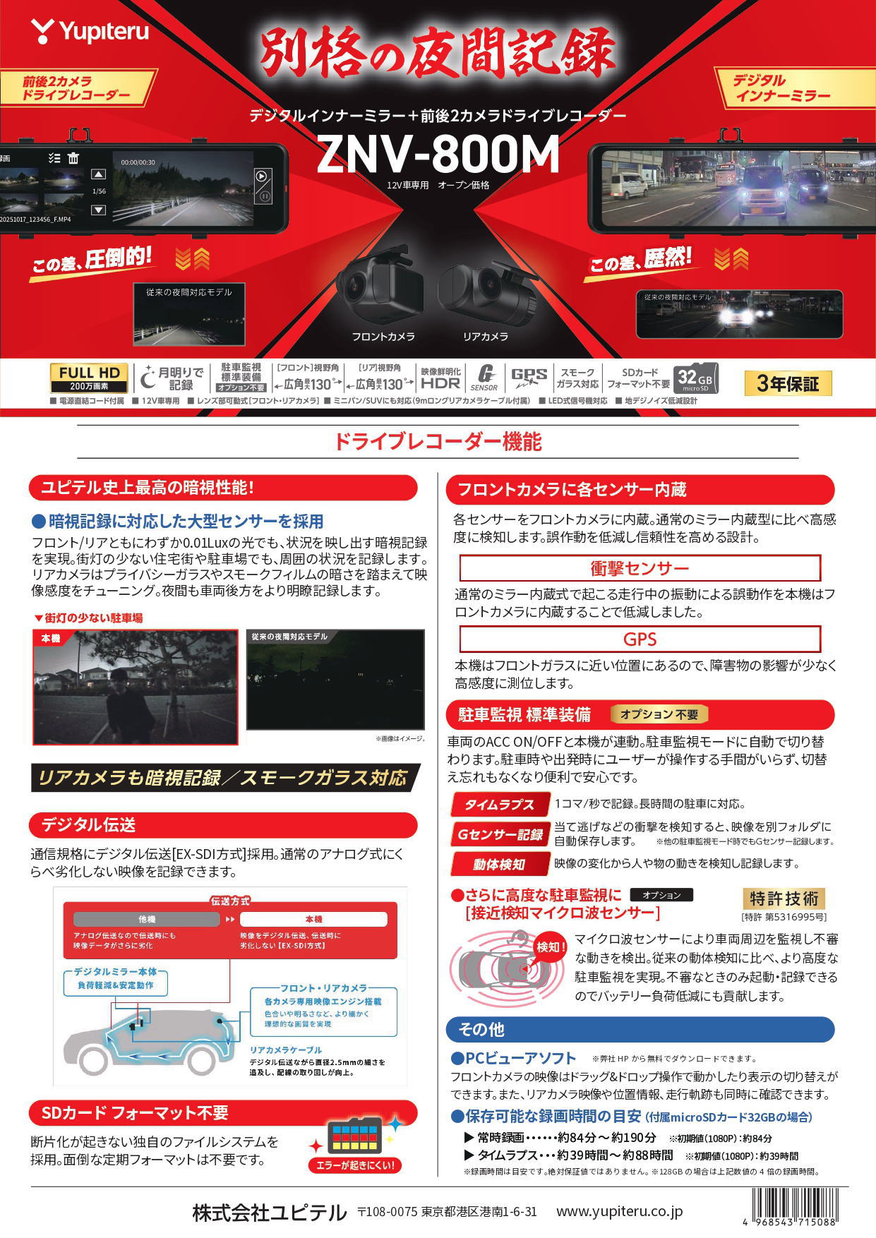 別格の夜間記録、暗視カメラ搭載。闇夜でこの明るさ。ユピテル史上最高の暗視性能。被写体最低照度 0.01Luxのドライブレコーダーと自動で眩しさを低減、後方車両のライトも白飛びしにくいデジタルインナーミラー